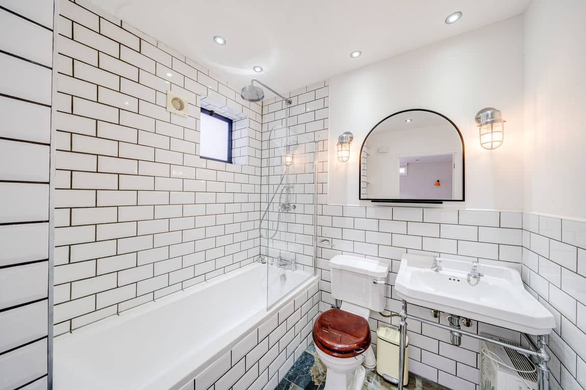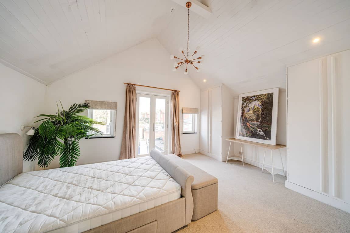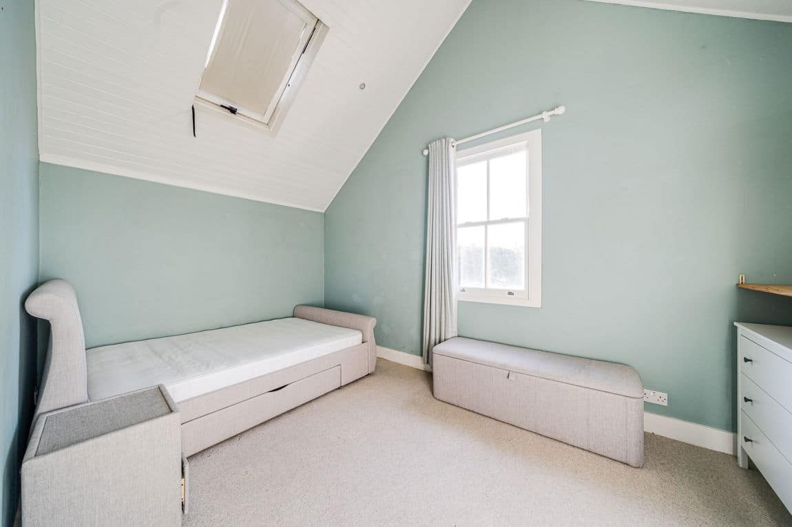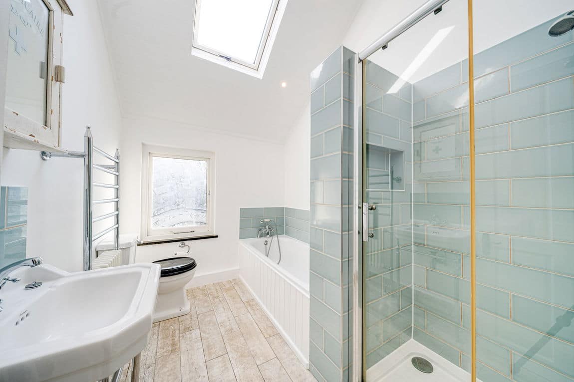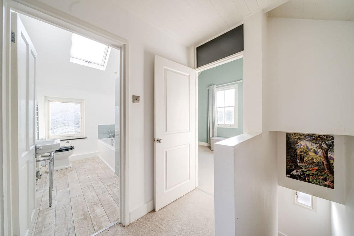 Upstairs, the main house offers two well proportioned double bedrooms and a family bathroom, all filled with natural light. Characterful details remain throughout, including tongue and groove ceiling panelling and original marble window sills, offering a subtle reference to the building’s industrial heritage.