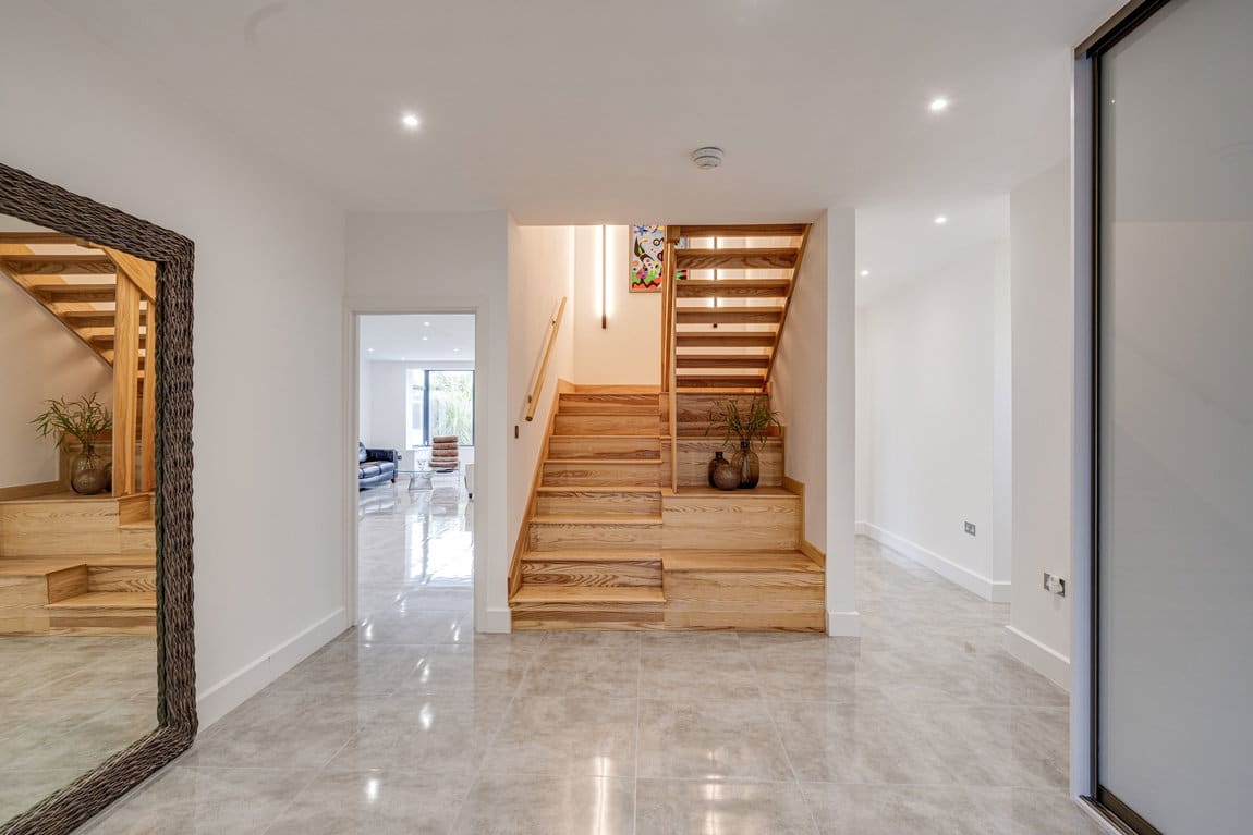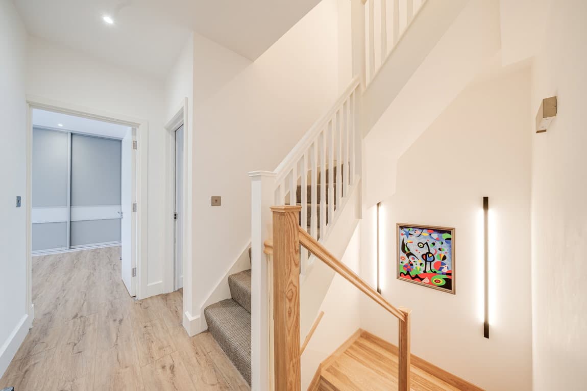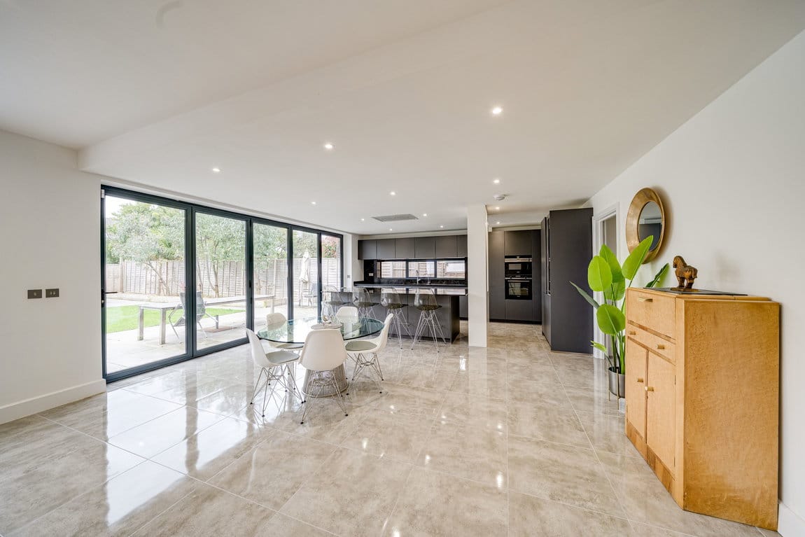 The house offers well balanced accommodation across three floors, with a layout that has been carefully designed to maximise both space and natural light. At the heart of the home is a generous open plan kitchen and reception room, providing a natural setting for both everyday living and entertaining. Large bi folding doors open onto the garden, creating a strong connection between the interior and exterior spaces.
