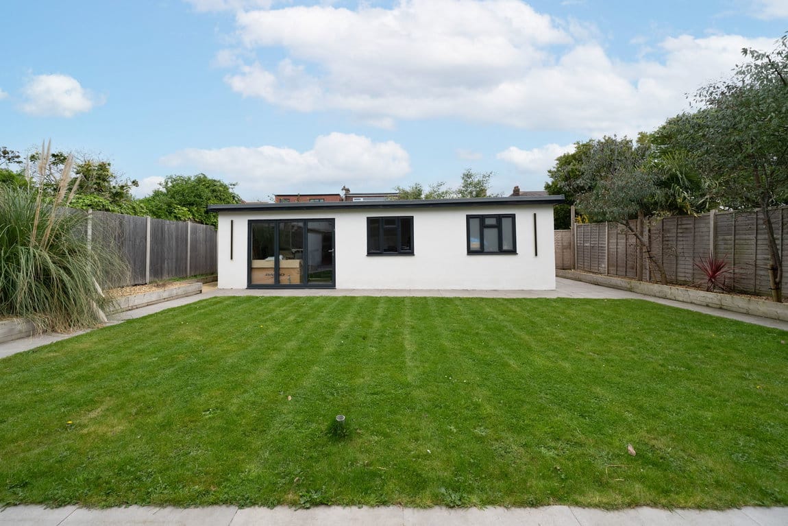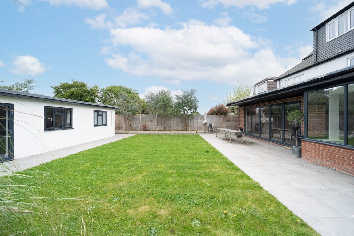 To the rear, the garden provides a generous outdoor setting, with the addition of a newly constructed outbuilding offering further versatility, whether as a workspace, gym or additional leisure space.
