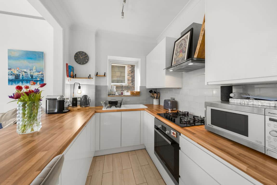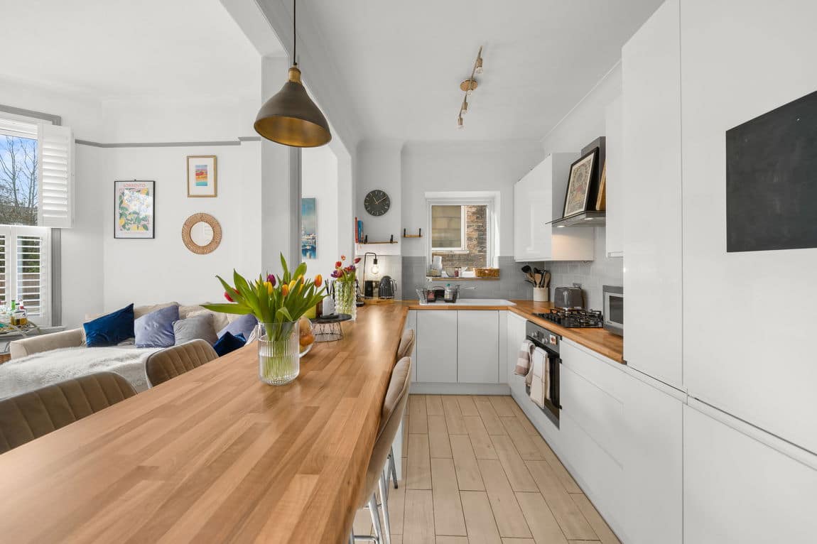 The interiors feel notably spacious, enhanced by particularly high ceilings and large windows which allow an abundance of natural light to fill the flat throughout the day. The reception and kitchen are arranged as a generous open plan room, creating an excellent setting for both everyday living and entertaining.