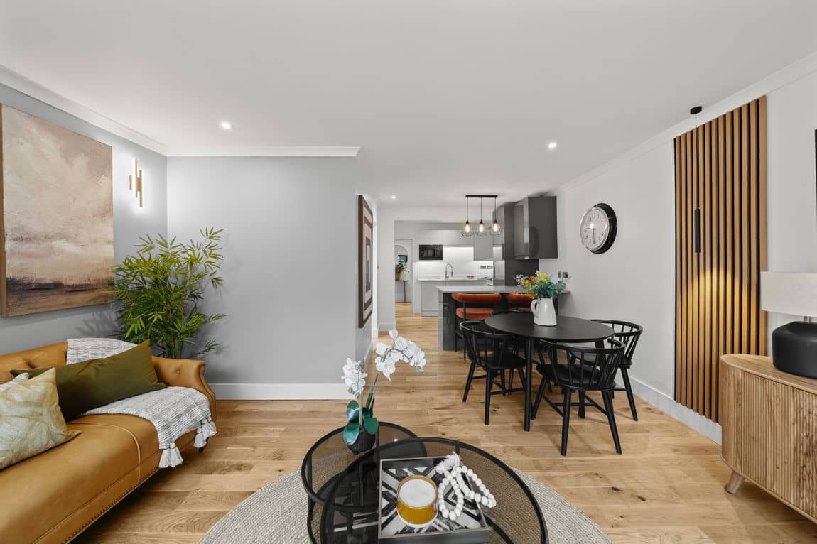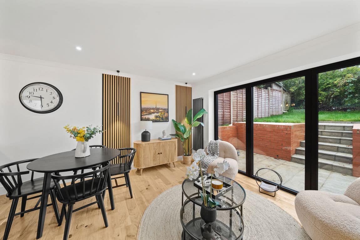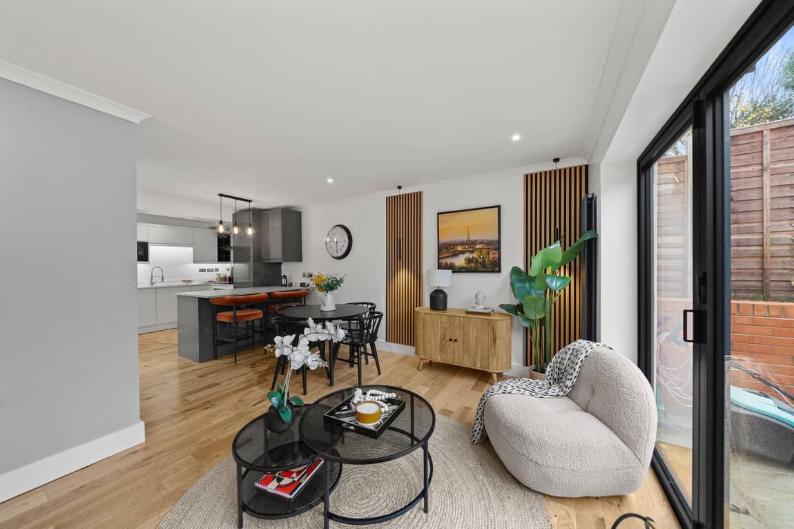 The property offers a spacious open plan reception room with bifolding doors opening directly onto a private south west facing landscaped garden, creating an excellent sense of light and flow. The newly fitted kitchen is well appointed with contemporary units and a breakfast bar ideal for both everyday living and entertaining.