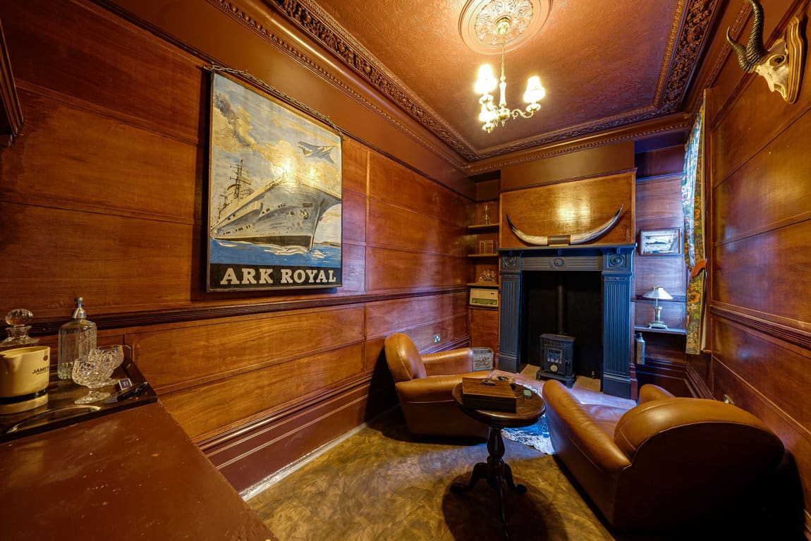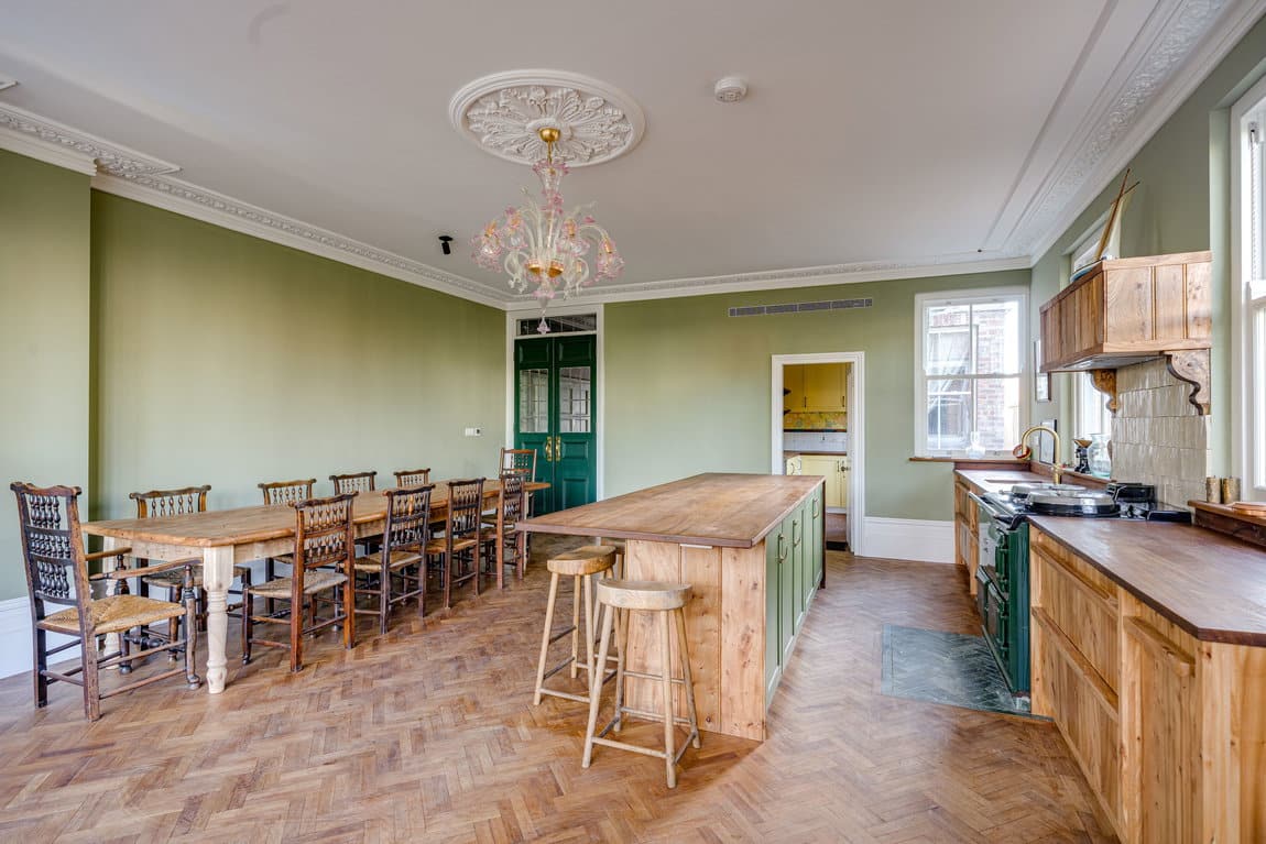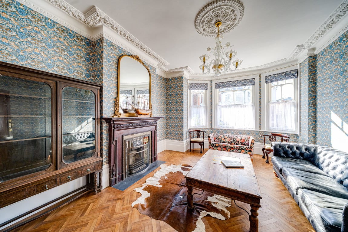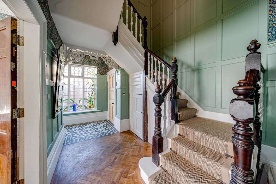 A reclaimed brick basket weave driveway leads to an elegant façade with double glazed timber sash windows. Inside, the entrance hall sets an Edwardian tone with high skirting boards, panelling, ornate cornicing, stained glass and original pediments. Reclaimed parquet flooring runs across the ground floor, linking the formal receptions, cigar room with leather flooring, cloakroom, laundry room and a highly practical dirty kitchen.