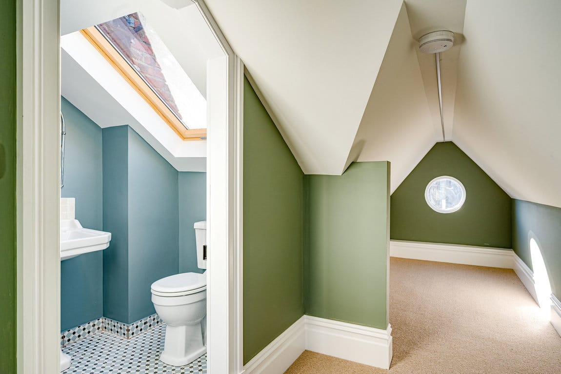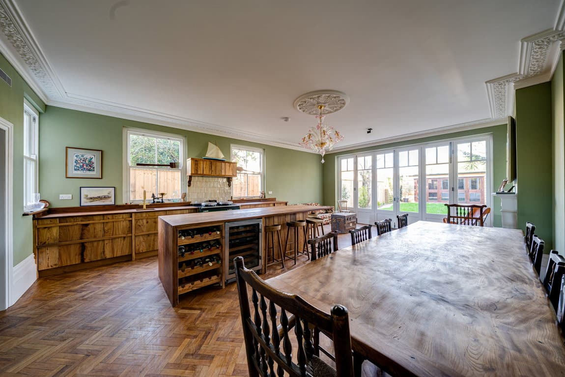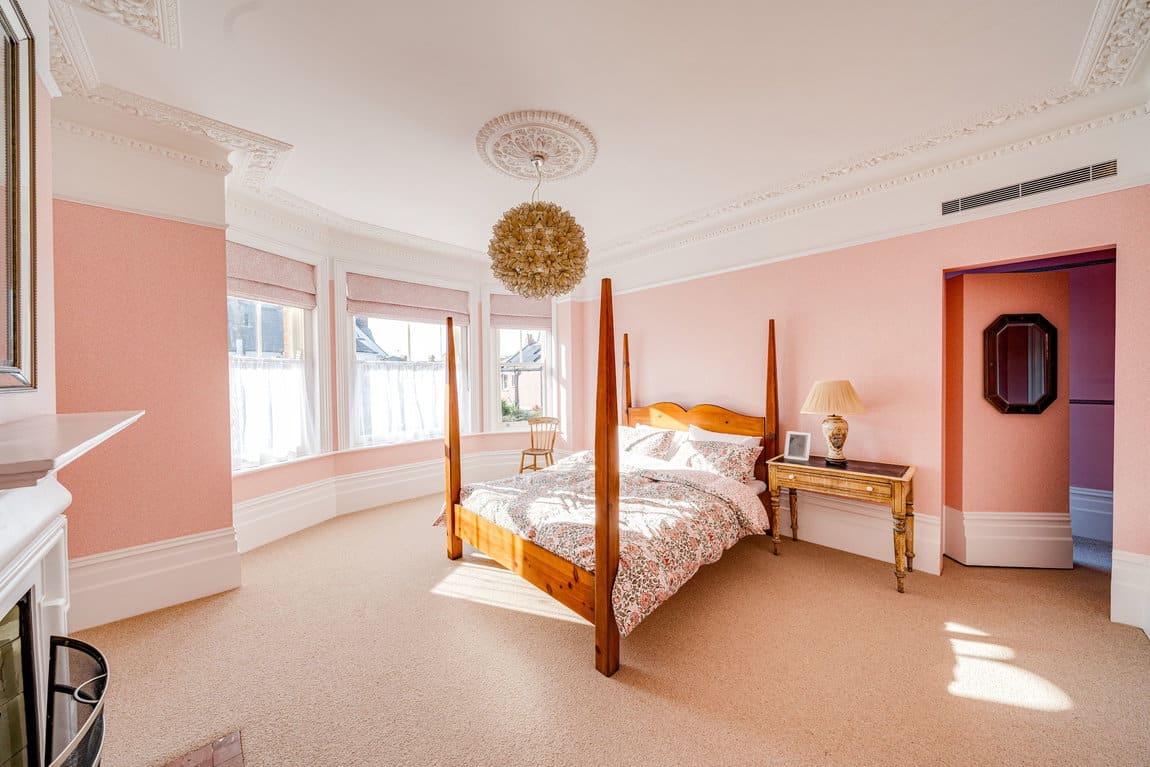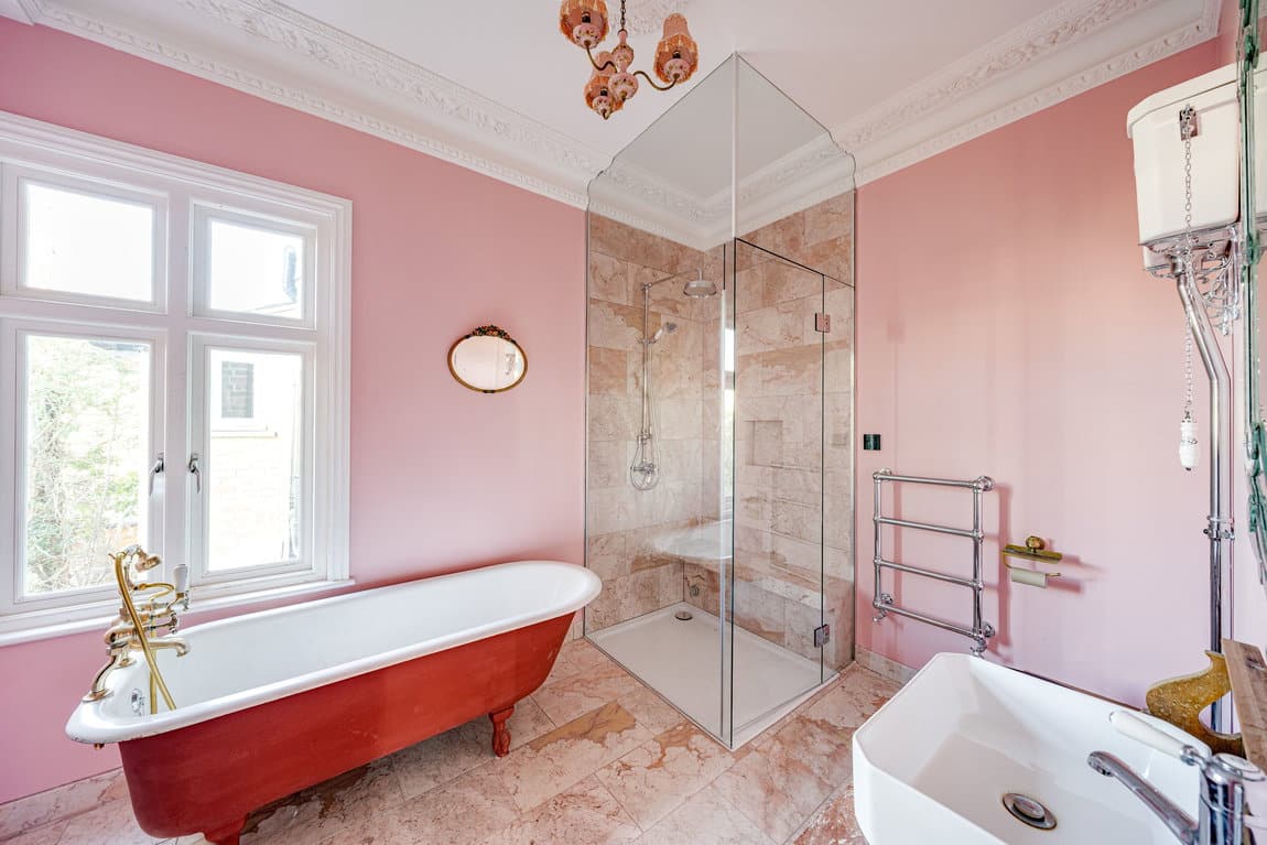 Upstairs, the principal suite features high skirtings, intricate cornicing, a secret walk through wardrobe and a luxurious ensuite with original fireplace, roll top bath, reclaimed Victorian washstand, steam shower and Fired Earth pink rose marble. Two further double ensuites sit along the hallway, while the rear suite enjoys vaulted ceilings and leafy views.
