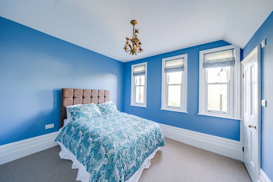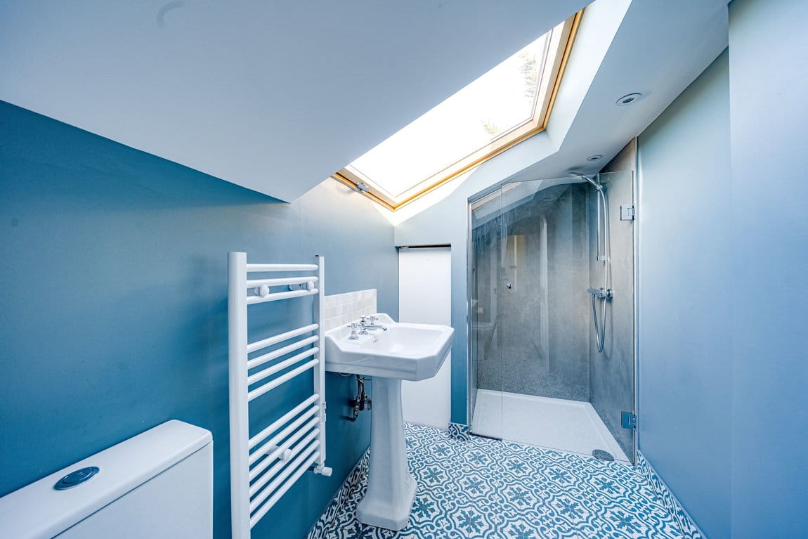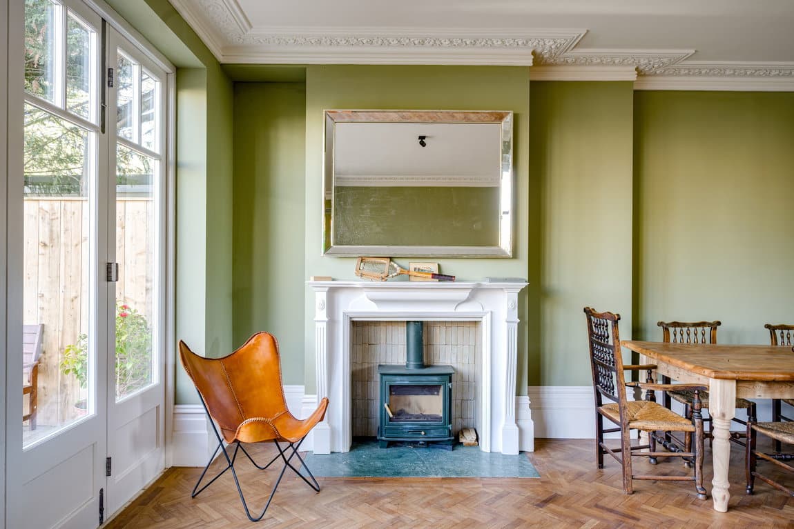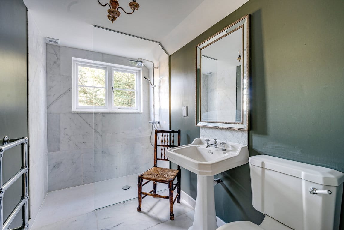 Upstairs, the principal suite features high skirtings, intricate cornicing, a secret walk through wardrobe and a luxurious ensuite with original fireplace, roll top bath, reclaimed Victorian washstand, steam shower and Fired Earth pink rose marble. Two further double ensuites sit along the hallway, while the rear suite enjoys vaulted ceilings and leafy views.