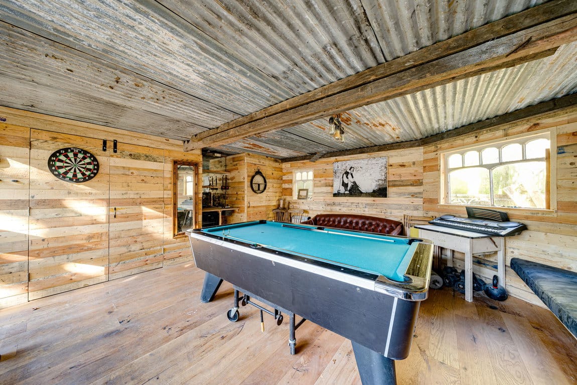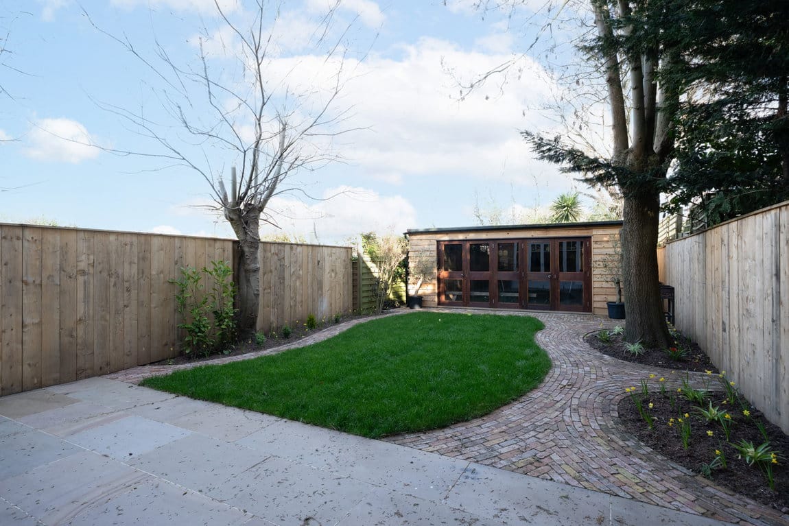 The heart of the home is the open plan kitchen and living space, handmade from reclaimed English Elm with Iroko worktops and an Aga. A Deffra approved wood burner anchors the seating area and Murano chandeliers bring a soft glow. Hardwood framed bifolding doors open to an Indian sandstone terrace and landscaped garden, leading to a fully fitted summer house with bar and facilities, ideal as a gym, studio or office.