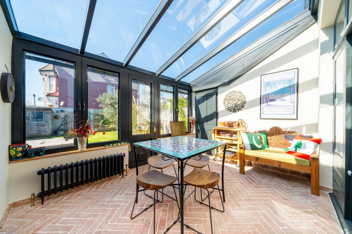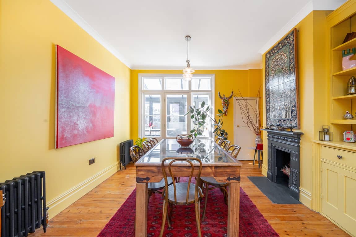 The living areas are generous and full of personality, with high ceilings, statement fireplaces and an abundance of natural light. A standout lime-toned kitchen leads through to a bright conservatory, perfect for indoor-outdoor living, and there are multiple reception rooms offering flexibility for family life or entertaining.