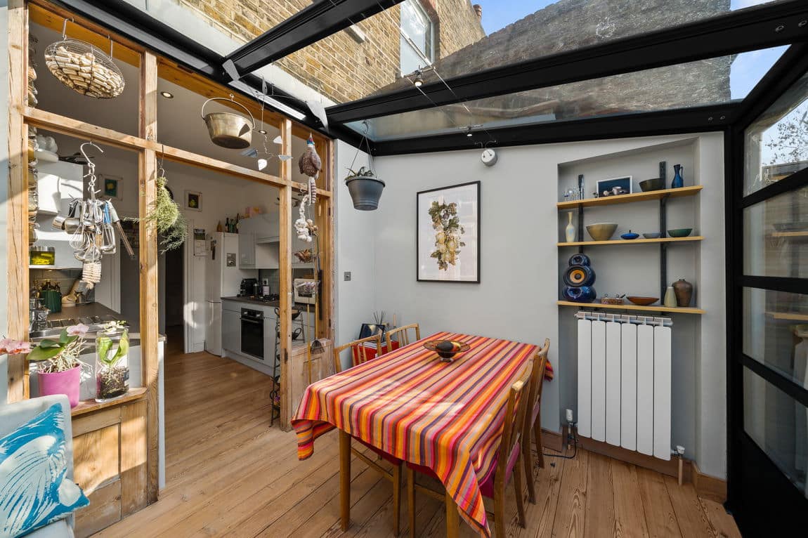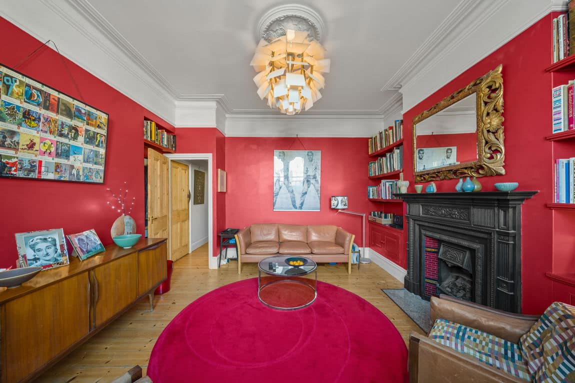 The flat opens into an entrance hall which leads through to a large reception room at the front of the property. The room has high ceilings and retains original features including cornicing, traditional skirting, stripped wooden floors and a original fireplace, creating a bright and comfortable living space.