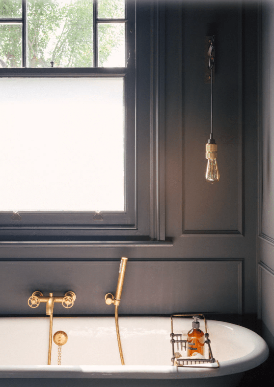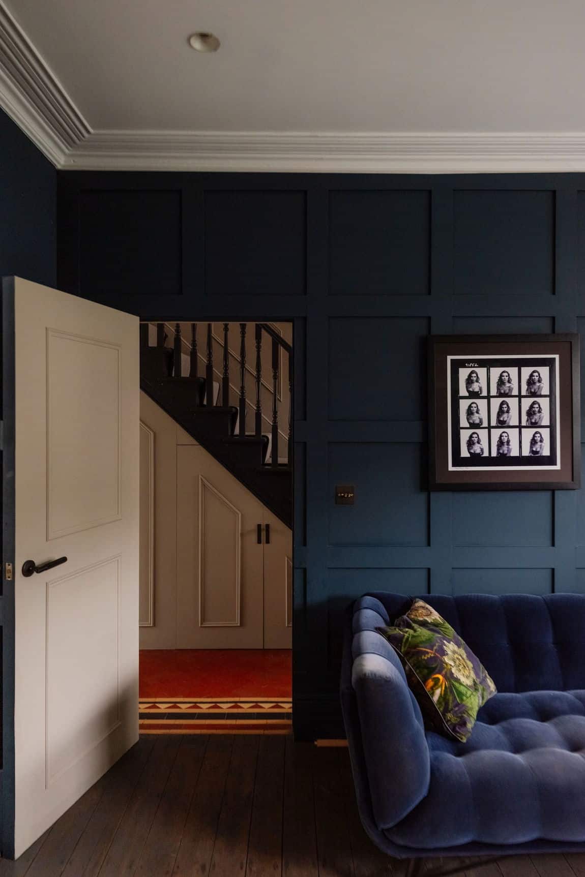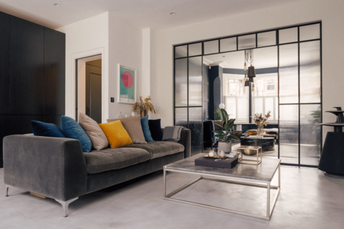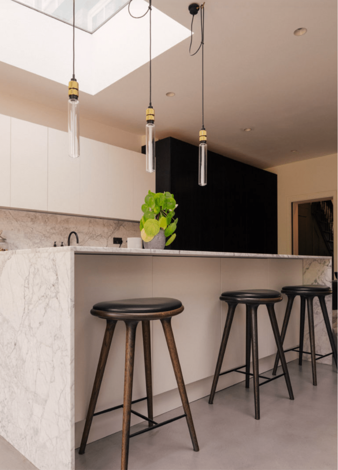 The front reception is rich and atmospheric, finished with reworked original style cornicing, an iron cast fireplace, timber flooring and Victorian style radiators. A bespoke Crittall style fluted glass door replaces the dividing wall, allowing light to flow through while retaining a sense of separation.