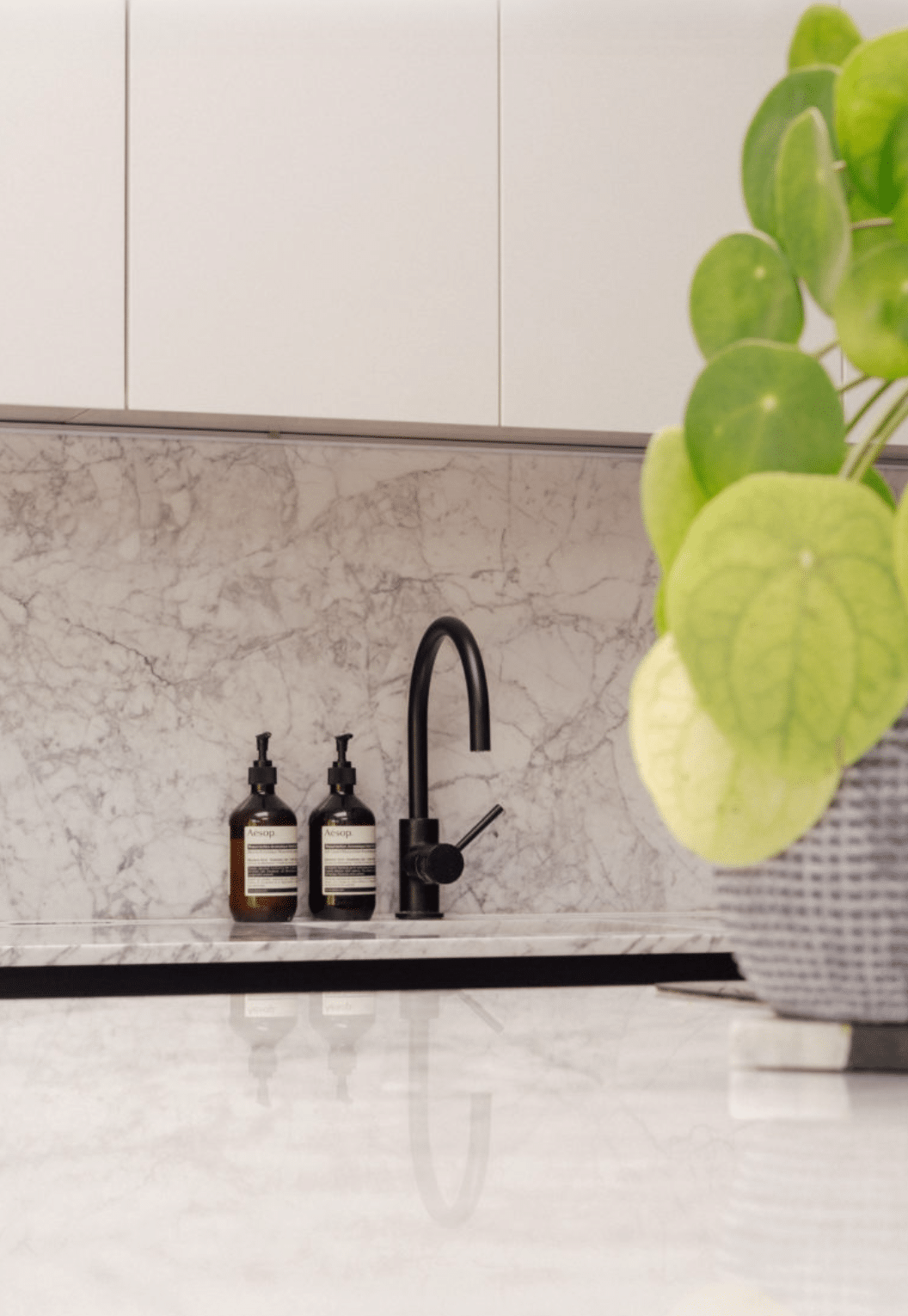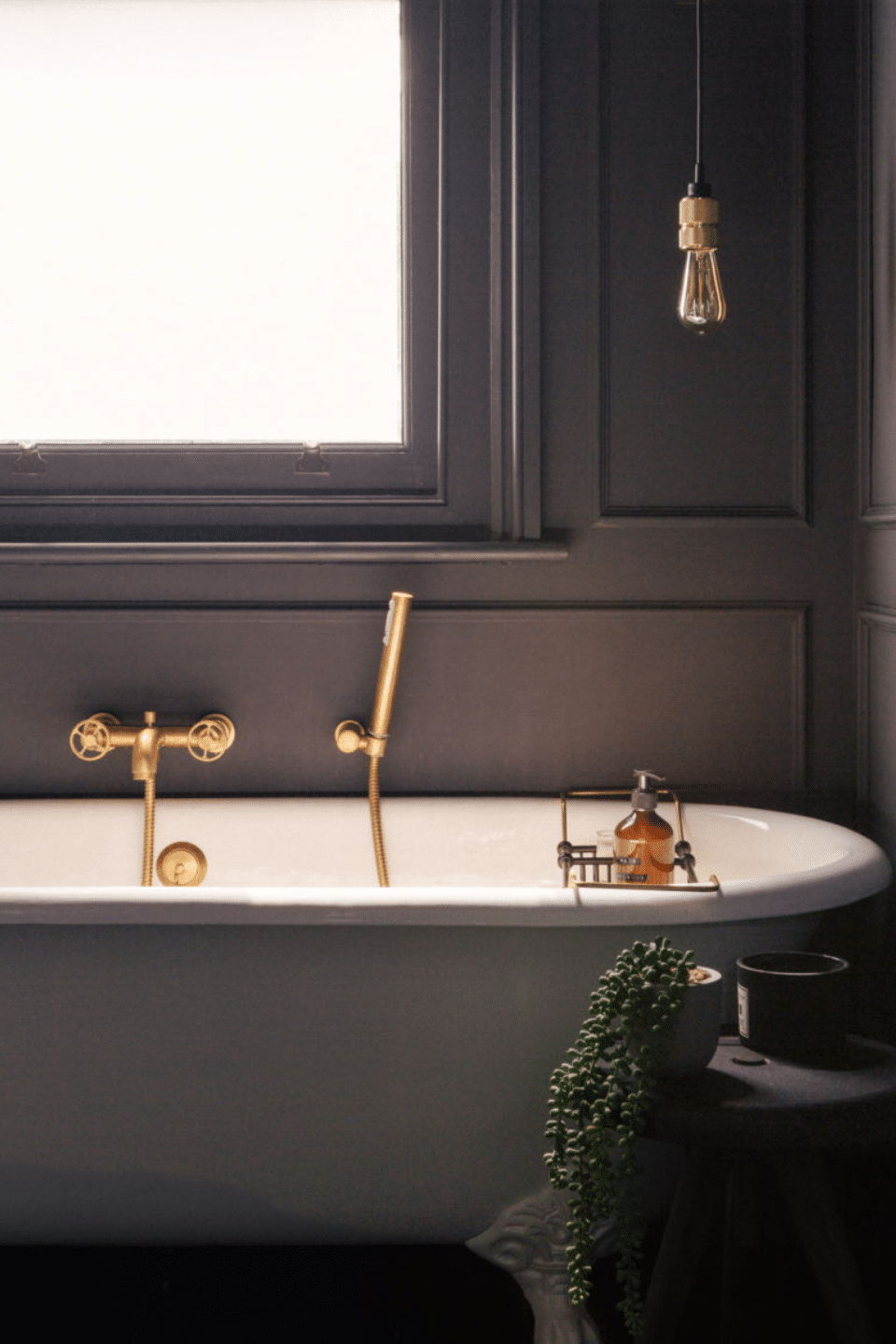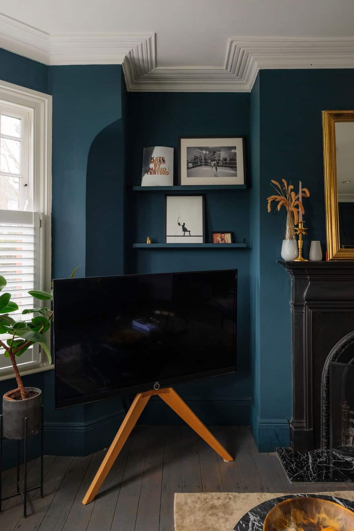The front reception is rich and atmospheric, finished with reworked original style cornicing, an iron cast fireplace, timber flooring and Victorian style radiators. A bespoke Crittall style fluted glass door replaces the dividing wall, allowing light to flow through while retaining a sense of separation.