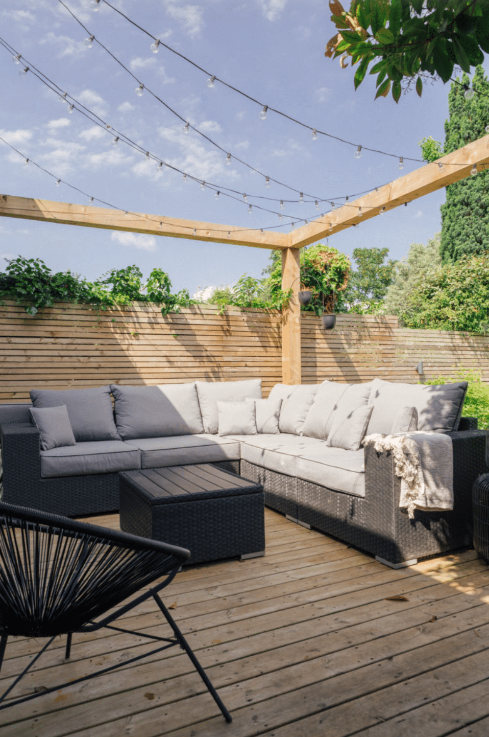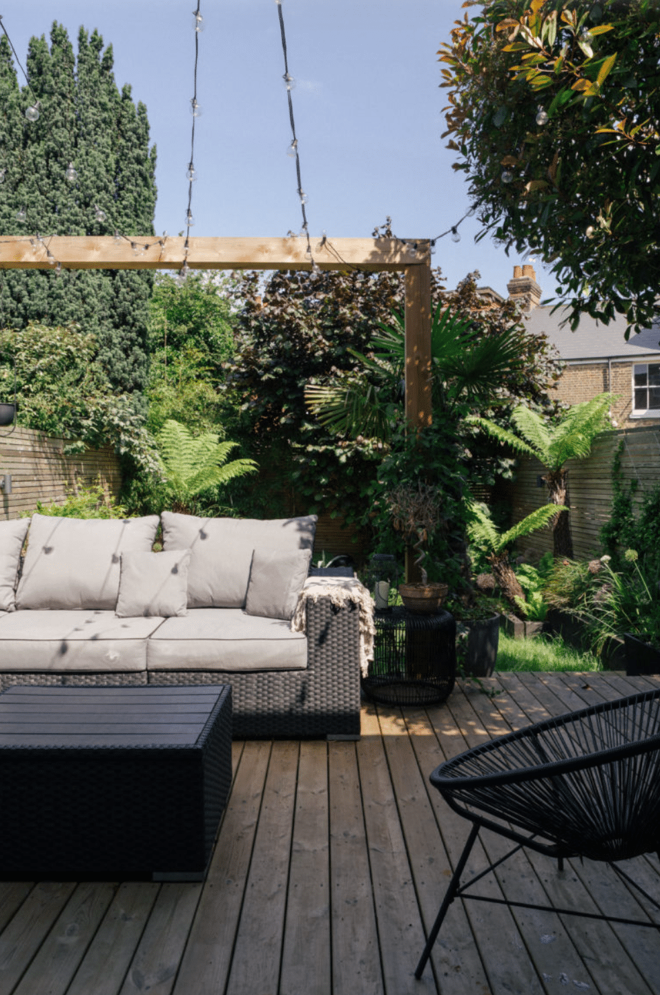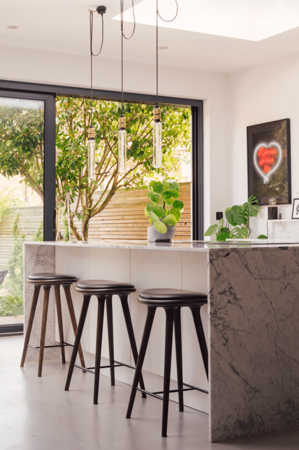 To the rear, a 4.5 metre extension creates an impressive open plan room stretching to over 8 metres in length. Polished concrete floors, marble worktops and a beautifully executed kitchen sit beneath oversized skylights and full height sliding glass doors. Notably, the ceiling height has been preserved throughout, a rare detail that elevates the entire space. The doors lead out to a smart decked terrace for dining and entertaining, followed by a manicured artificial lawn with a far more refined, landscaped finish than traditional AstroTurf.