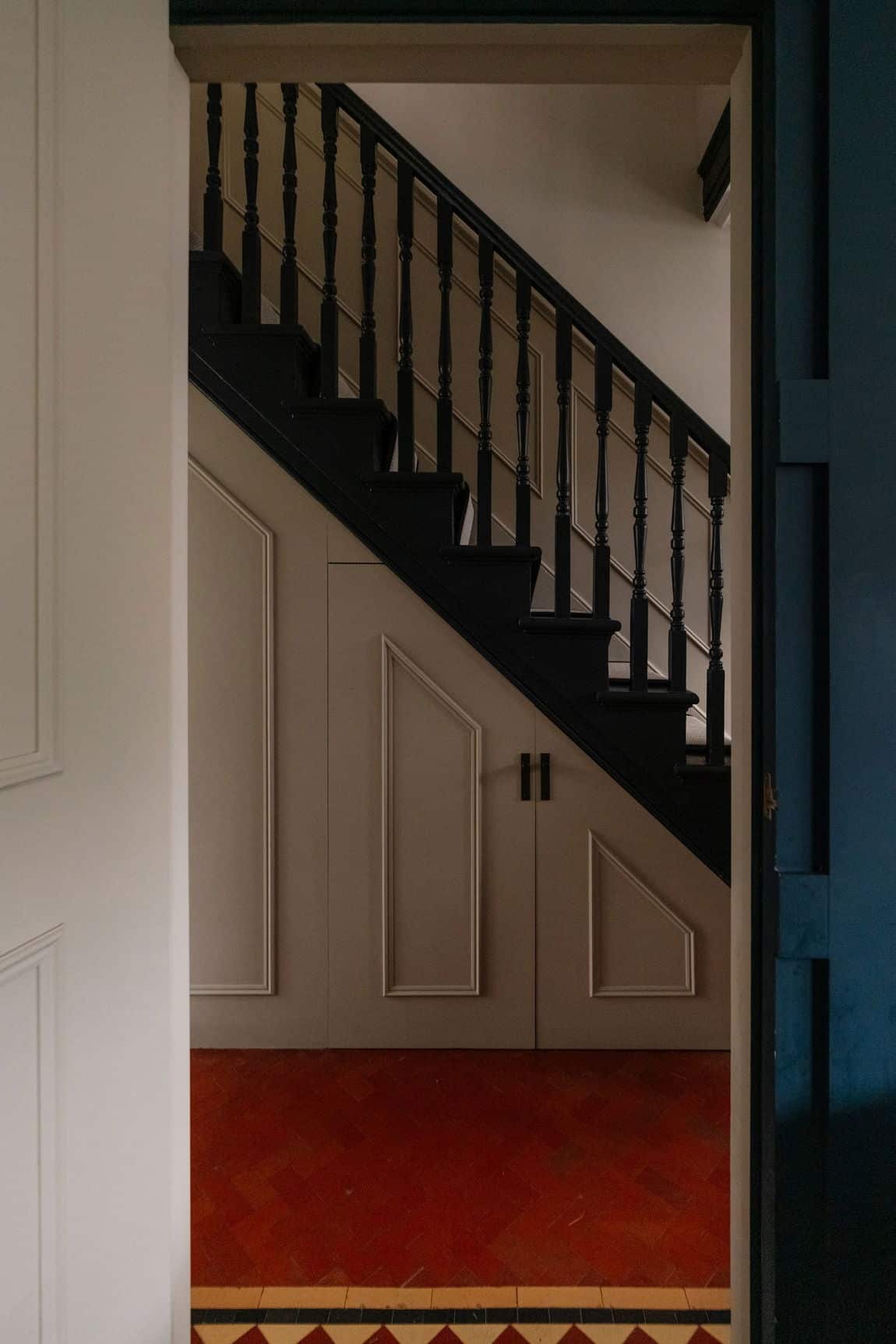The approach immediately stands out. Ornate timber detailing frames the porch, while the dark, moody façade gives a subtle Gothic edge without ever overpowering the home’s elegance. An original front door with stained glass opens into a striking entrance hall laid with classic red tessellated tiles, setting the tone for what follows.