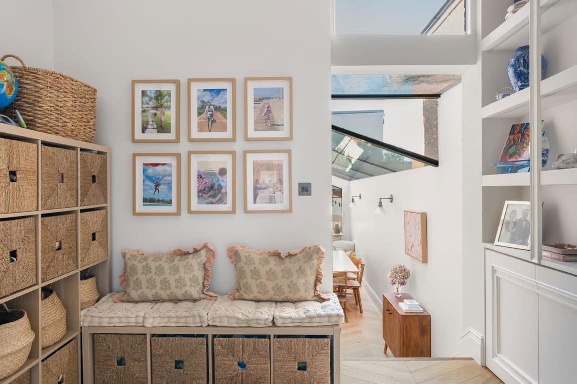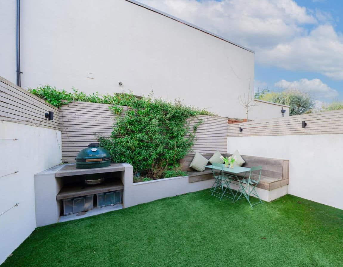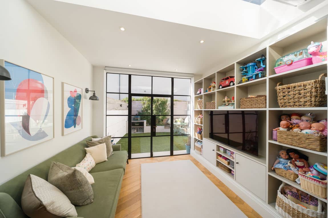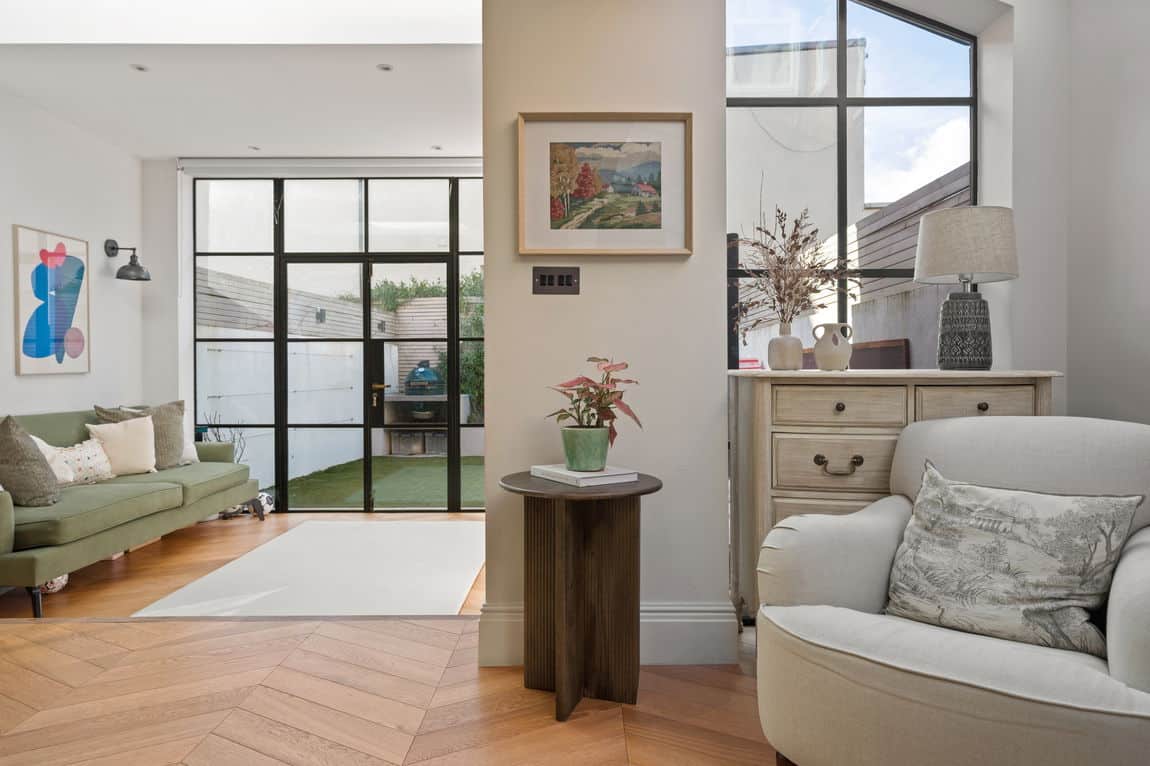 To the rear sits a bespoke deVOL kitchen, flooded with light from expansive skylights and floor to ceiling Crittall style doors. These open onto a west facing private garden with a BBQ area and custom built outdoor seating, creating a seamless indoor outdoor flow.