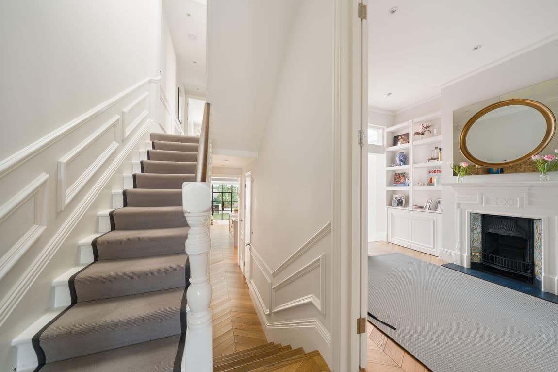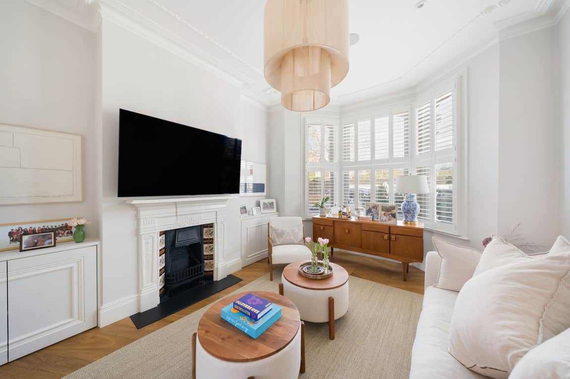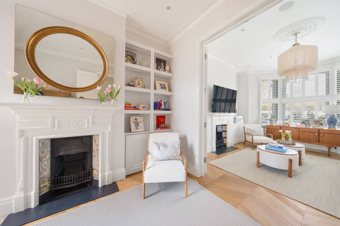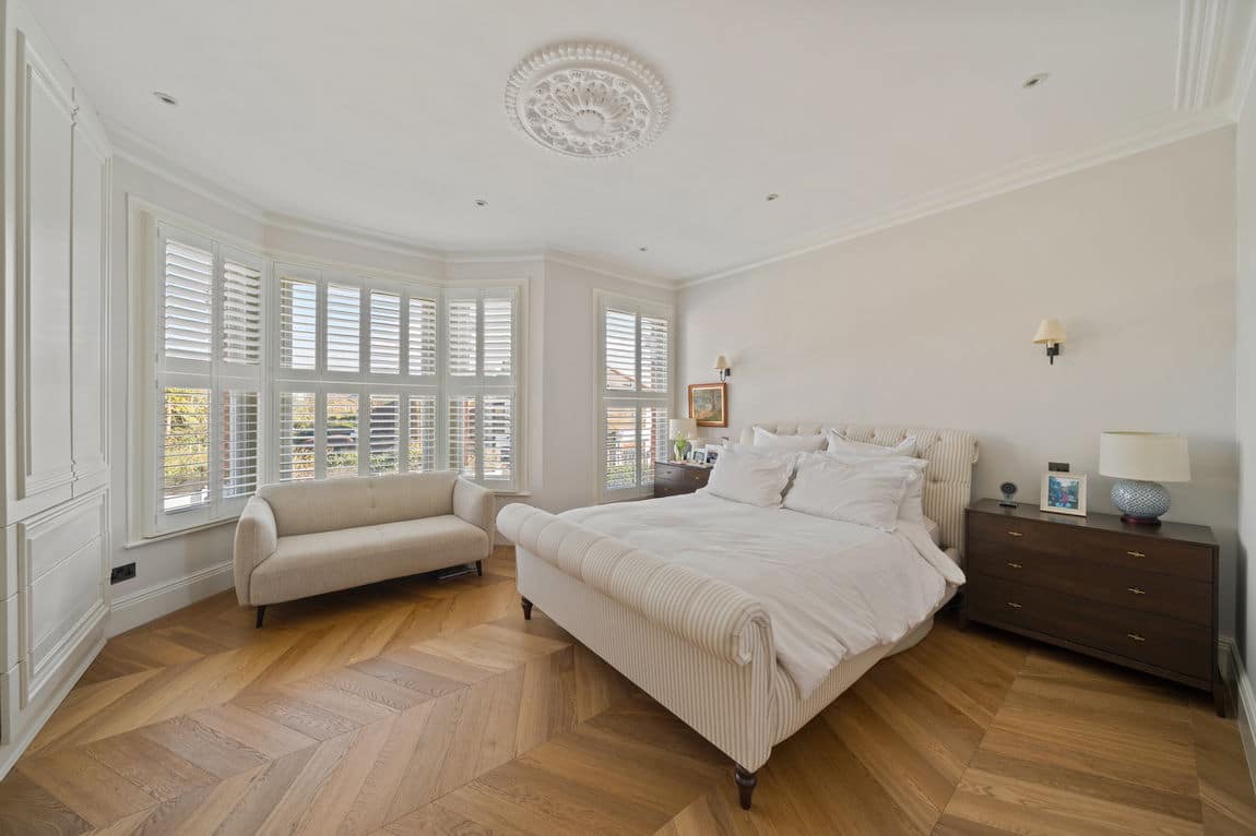 The ground floor showcases solid oak chevron flooring throughout. A grand double reception room with high ceilings and ornate cornicing reflects the home’s original charm, while bay and rear windows draw in excellent natural light. Decorative fireplaces create elegant focal points, ideal for both formal entertaining and relaxed family living.
