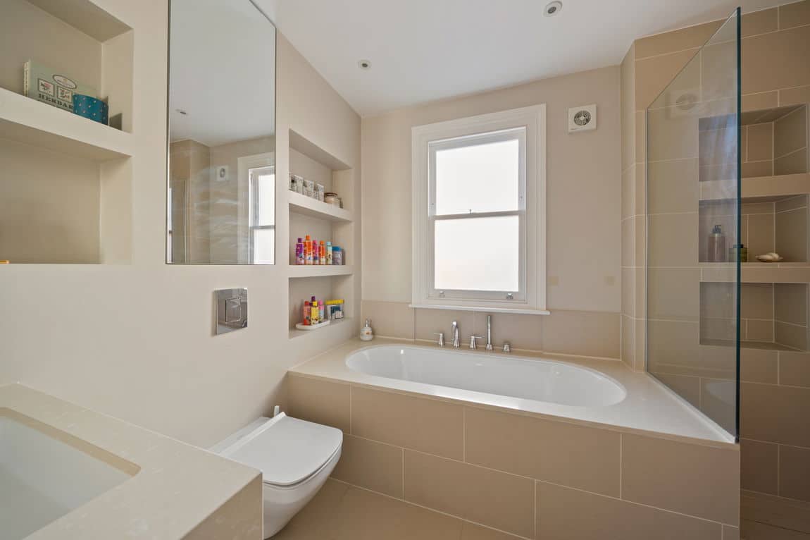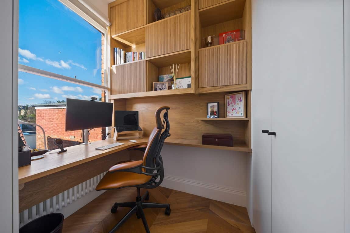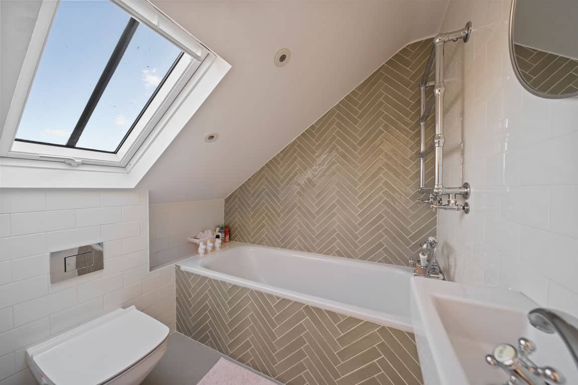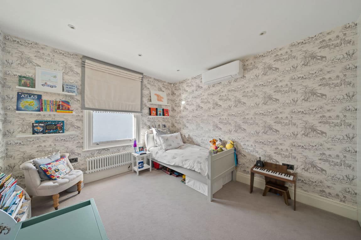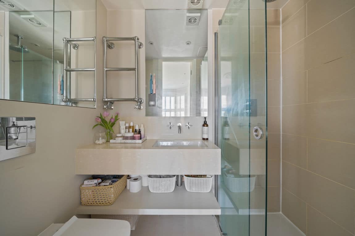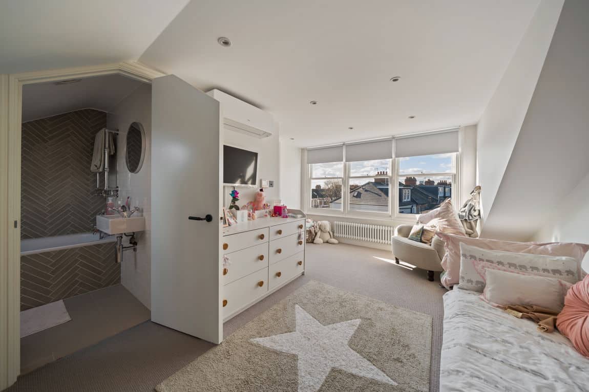 The principal suite occupies the first floor and includes built in wardrobes, a bespoke walk in dressing room and home office, and a beautifully finished en suite. A second bedroom and contemporary family bathroom complete this level. The top floor loft provides a spacious third bedroom with en suite. All bedrooms benefit from air conditioning for year round comfort.