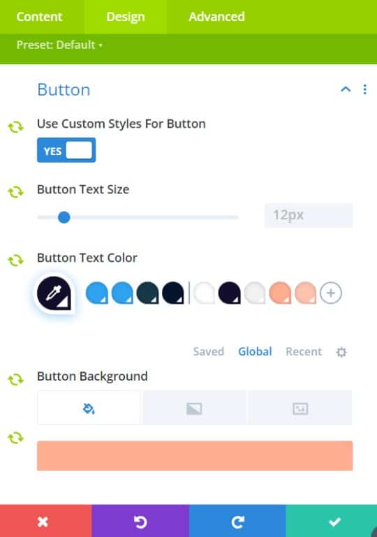 to check this, we want to click on the first button and go into its settings like we did when changing the global colours, but this time when the window opens we want to go into the ‘Design’ tab and go down to the dropdown named ‘Button’