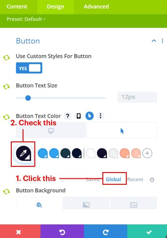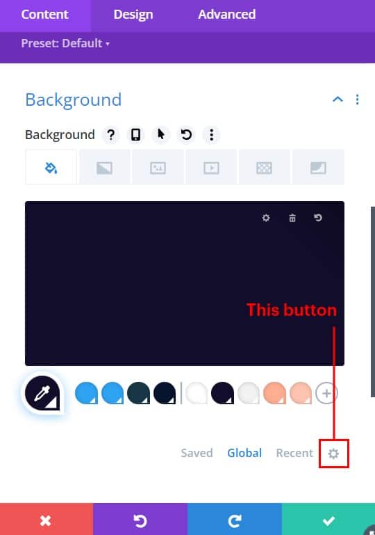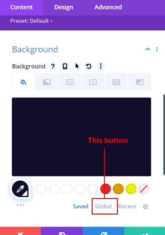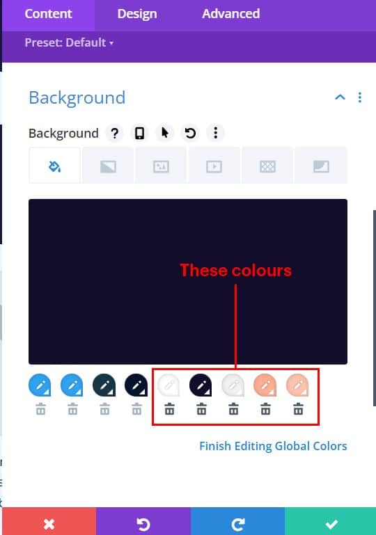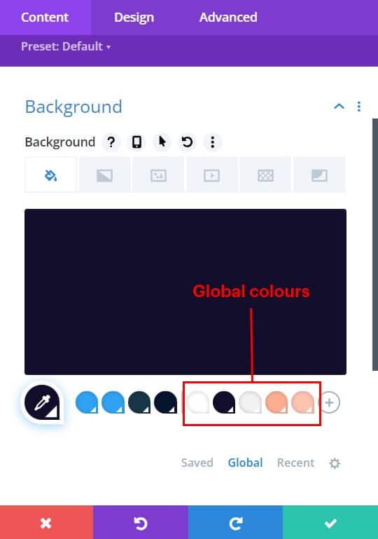Open the ‘background’ dropdown in the content section and then click the word ‘Global’ to view the global colours